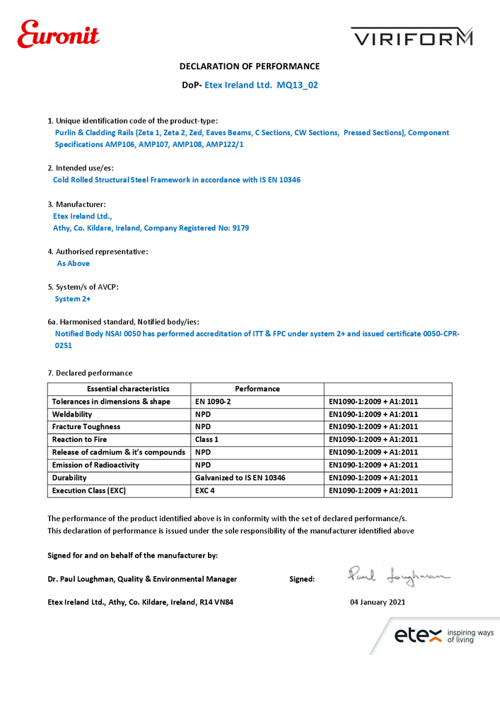 Metal roofing and cladding DOP Declaration of Performance Metal roofing and cladding DOP Metal purlins cladding rails DOP